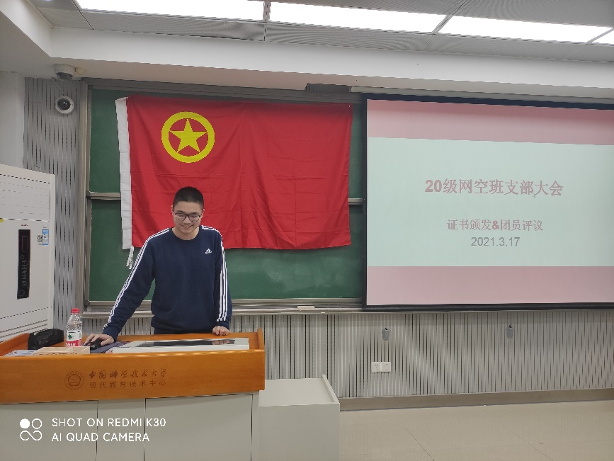 2021年3月17日下午,网络空间安全学院本科20级王小谟英才班在3A109教室举办了证书颁发暨团员评议活动,班主任张璠老师出席了此次活动,由团支书张天宇同学担任主持人。