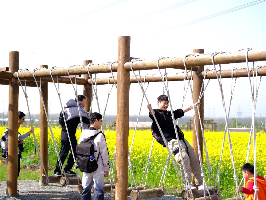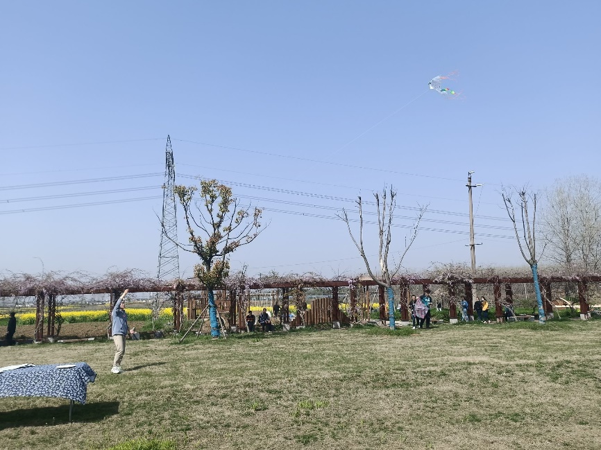 到达马郢村后,同学们上午参观村社,自由活动。正值阳春三月,众多同学纷纷在草地上放起风筝。迎着春日的阳光和和煦的春风,各色各式的风筝升上天空。同学们或是沿着村路惬意的漫步,或是与动物亲热接触,参观马场,喂养小羊,或是在草地上荡秋千。