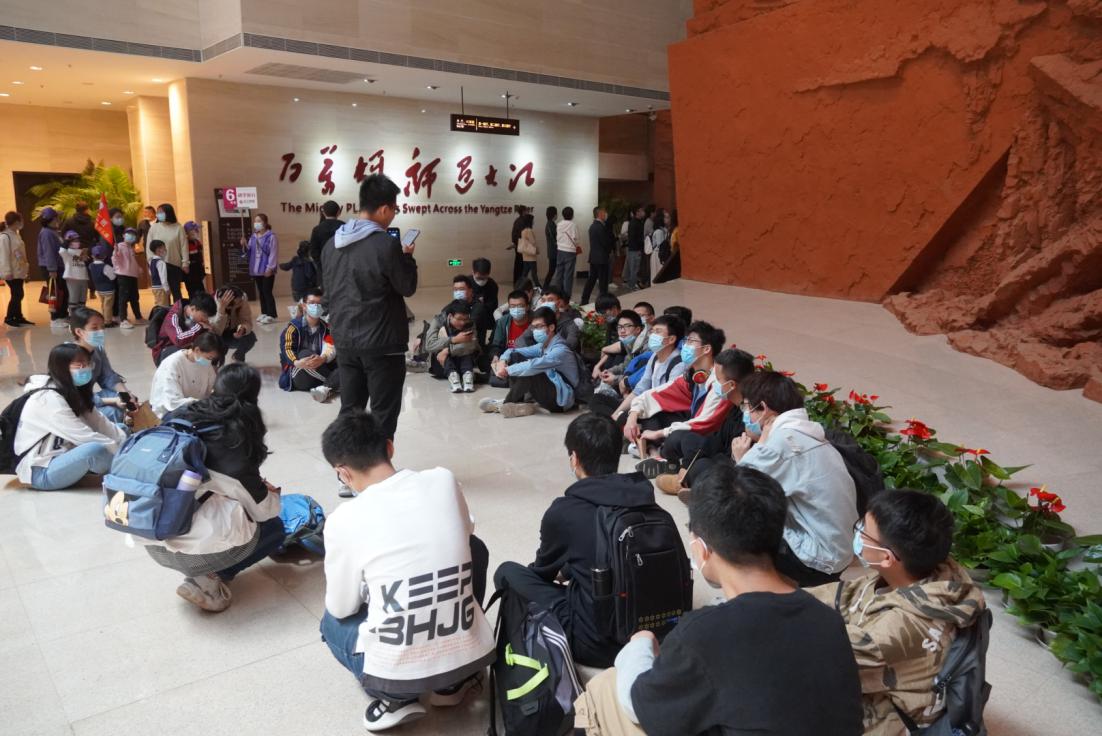 此次党课,同学们在团委的带领下赴渡江战役纪念馆,在展馆内大厅的角落席地而坐,在浓厚的历史氛围下开展了此次主题党课。