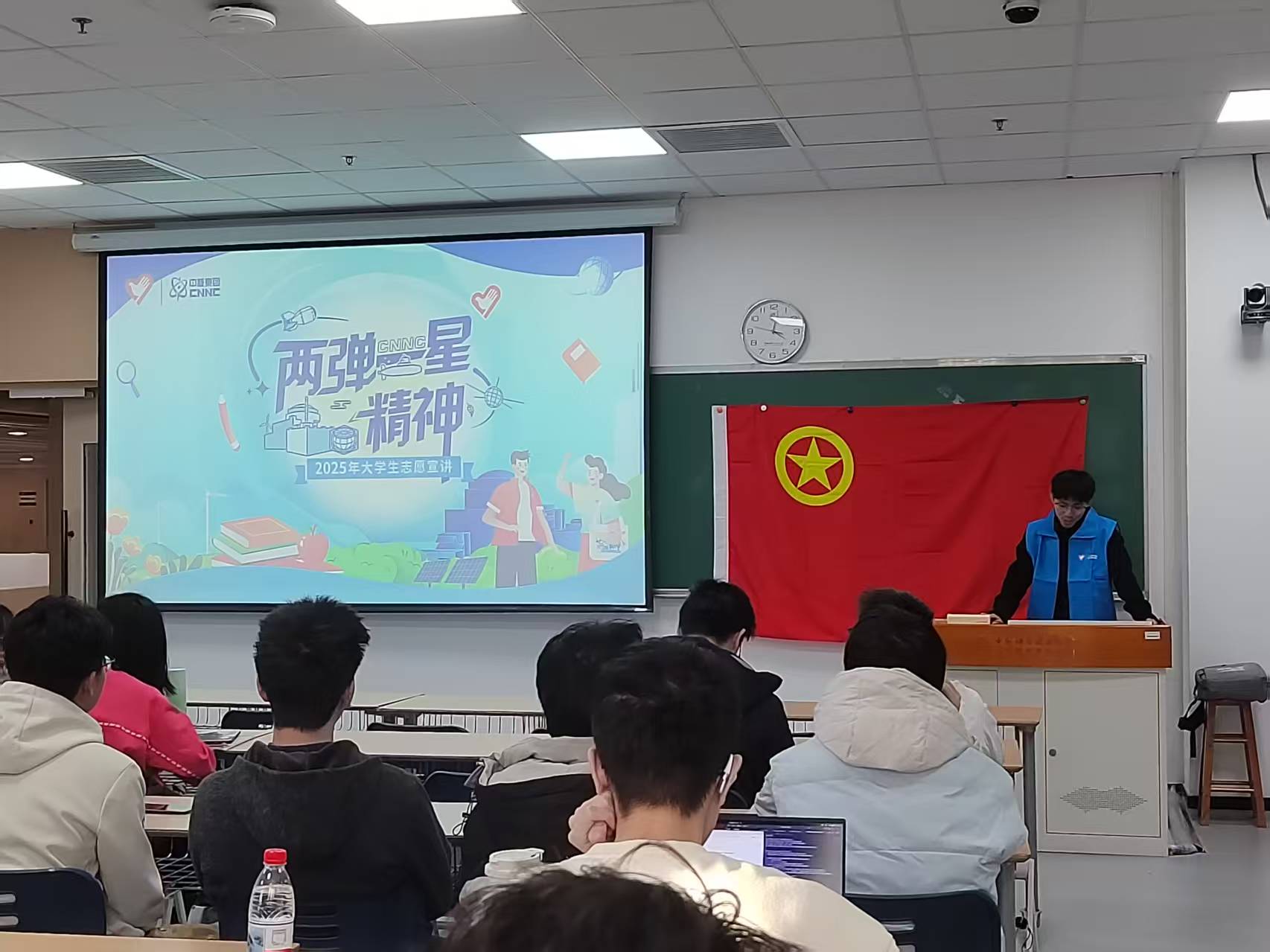 宣讲过程中,班主任刘桂英老师结合自身科研经历,补充介绍了"两弹一星"精神对当代科技工作者的启示。她强调:"在科技竞争日益激烈的今天,这种精神依然是我们攻克'卡脖子'技术的精神动力。"互动环节中,同学们就"如何在新时代践行两弹一星精神"展开讨论,有学生说道:"作为信息学子,我们要把个人理想融入国家需求,在人工智能、芯片研发等领域勇攀高峰。"
