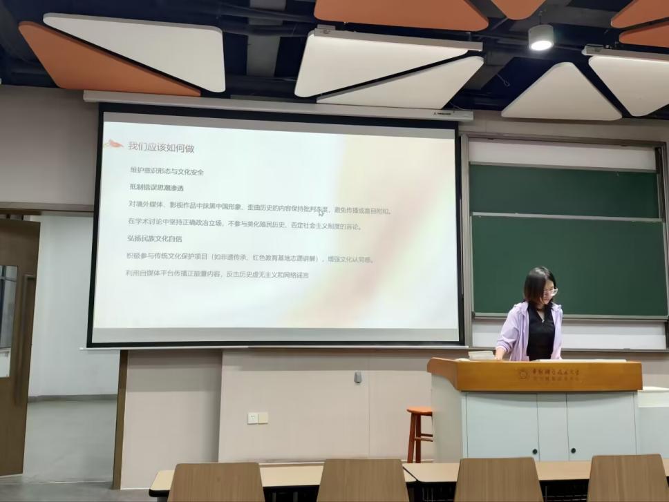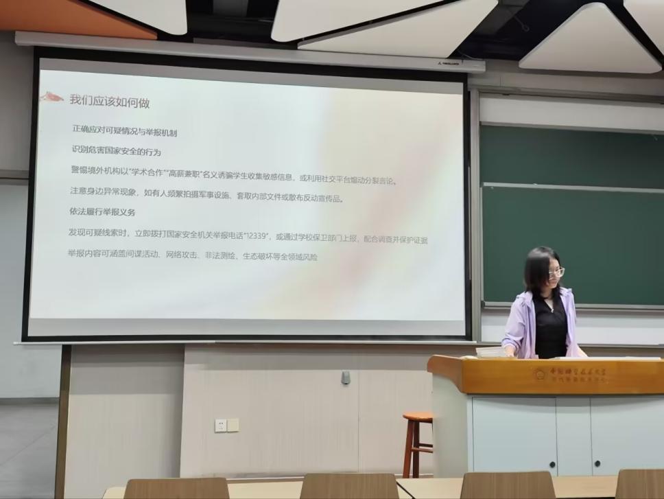 紧接着,针对青年学生群体特点,主持人提出具体防护要求。她呼吁同学们严守网络与信息安全,警惕社交媒体敏感信息泄露,防范新型风险;规范涉外交往,强调保密审查制度,抵制境外势力诱骗收集情报行为;强化生态安全意识,严禁携带境外物种入境,严格实验室生物安全管理;建立“全员防线”,要求同学们依法履行举报义务。同时,在意识形态领域,她还呼吁同学们坚决抵制境外媒体歪曲历史、抹黑中国形象的内容,在学术讨论中坚守政治立场,积极参与非遗传承、红色教育等文化自信实践,运用自媒体传播正能量,抵御历史虚无主义思潮。