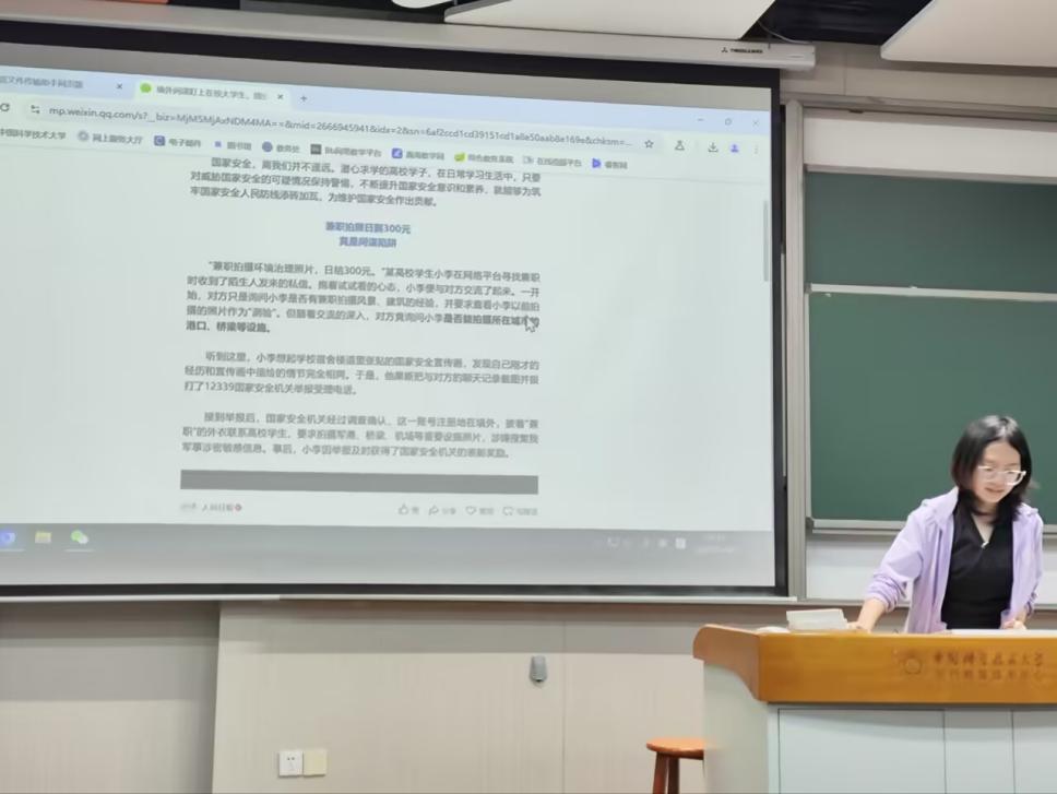 随后,主持人为同学们展示了《人民日报》关于针对大学生的境外间谍陷阱的文章,用真实生动的案例警示同学们要警惕生活中身边的可疑情况,严防可能对国家安全产生威胁的间谍陷阱。