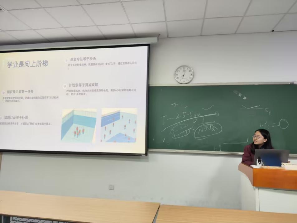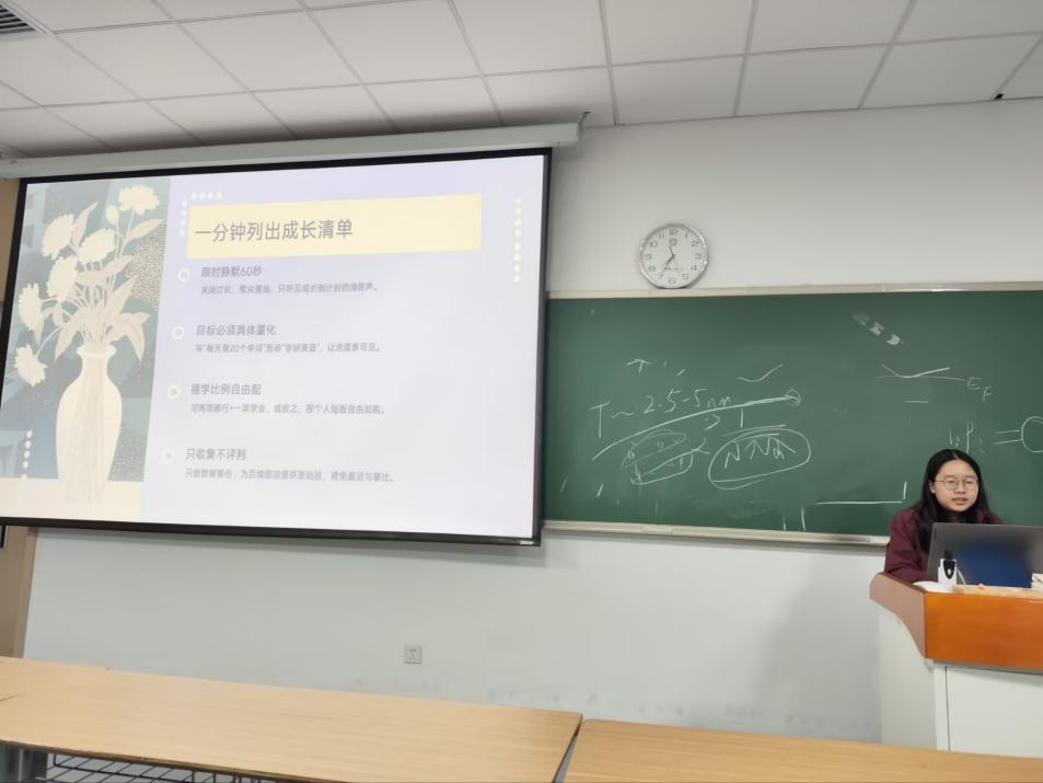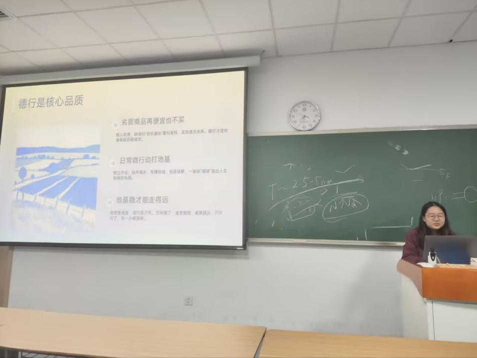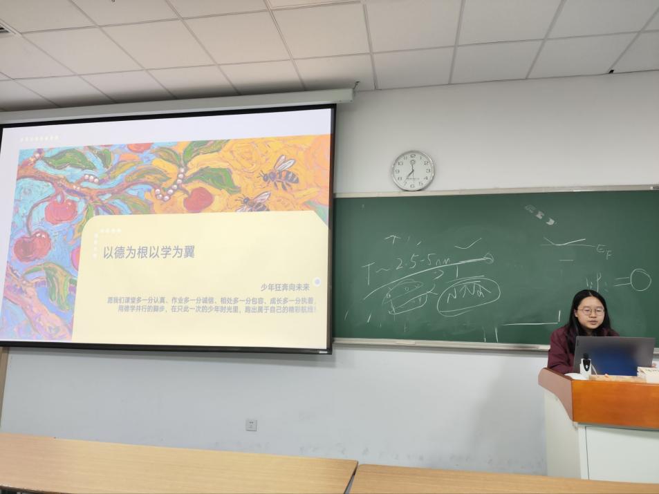 2025年11月13日晚,中国科学技术大学2023级本科4班于GH-320教室举办“不负少年时,德学并行筑成长”主题班会。本次班会组织委员庄欣瑶同学担任主持人,全体班级成员现场参与。活动以“德学并行”为核心主线,结合“双 11”节点展开,旨在引导同学们明确成长方向、夯实德行与学业基础。