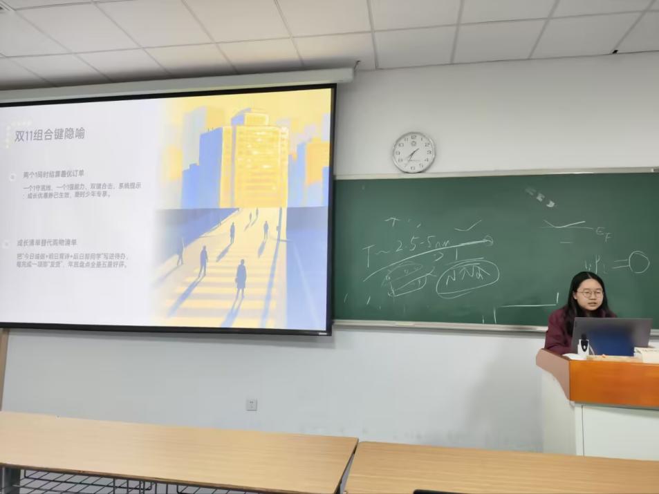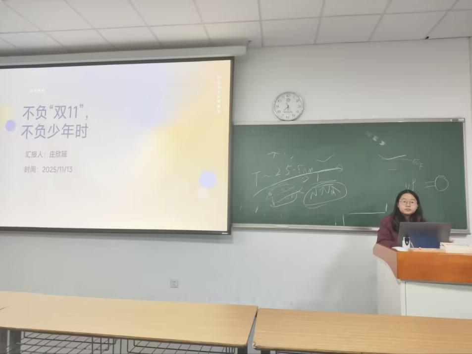 此次班会以 “不负‘双 11’,不负少年时” 为开场切入点,将双11购物狂欢的消费导向性与青年成长的积累导向性进行了比较,提出将时间和精力从购物狂欢转向成长协调。明确以德才兼备做为青年成长的支撑,为班会奠定价值基调。