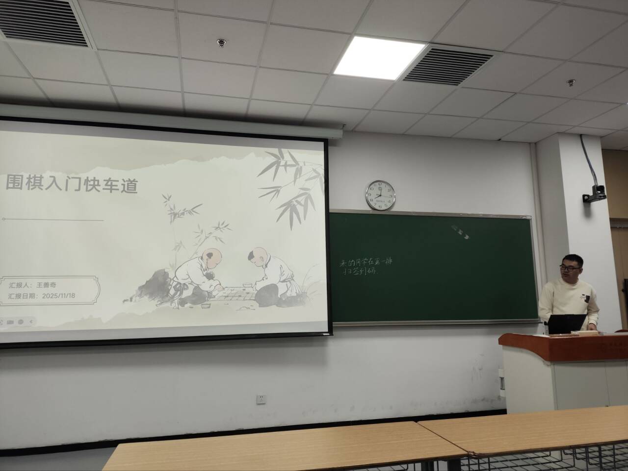 为深化同学们对围棋文化及人工智能时代人类智慧价值的认知,2025年11月18日晚,信息科学技术学院2023级4班在GH-320教室举办“围棋,人类与 AI 智力抗争的堡垒”主题班会,本次活动由文艺委员王善奇同学主持开展,2304班的同学们积极参与活动。