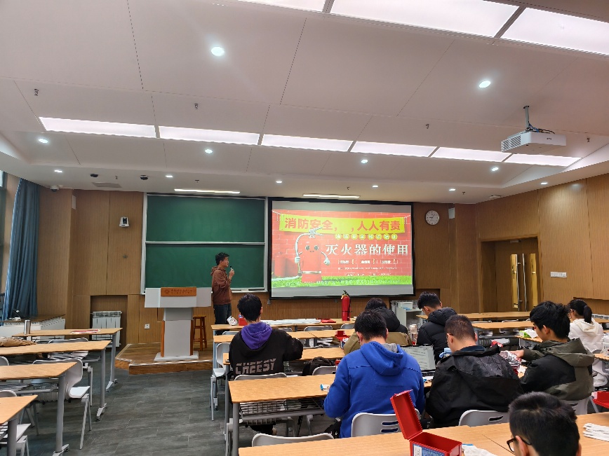 活动伊始,张子奕同学围绕消防安全核心知识进行系统讲解。他结合校园及生活中常见的火灾案例,生动阐述了正确应对火灾的重要性。重点讲解聚焦灭火器分类、适用场景及核心使用方法,通过“提、拔、握、压”四字使用口诀和专业教学视频演示,使同学们快速掌握操作要领。专业细致的讲解搭配清晰的操作演示,让同学们真切领会到“隐患险于明火,防范胜于救灾”的深刻内涵。