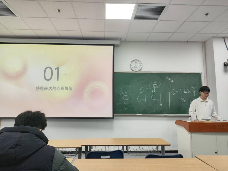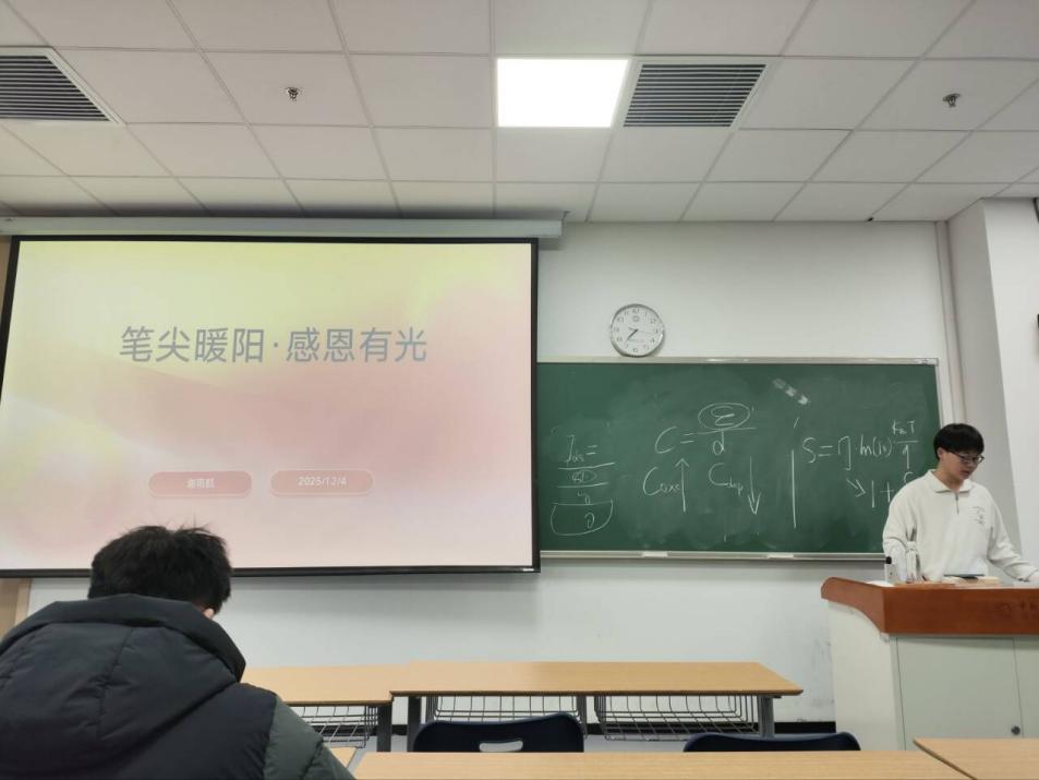 为了积极响应学校第四届“11.25”心理健康教育主题活动月的号召,2025年12月4日晚,信息科学技术学院2023级本科04班在GH-320教室成功举行了“笔尖暖阳·感恩有光”明信片传情行动。本次主题活动由班级心理委员谢雨航主持,活动内容为手写明信片寄送给父母、师长或重要友人。