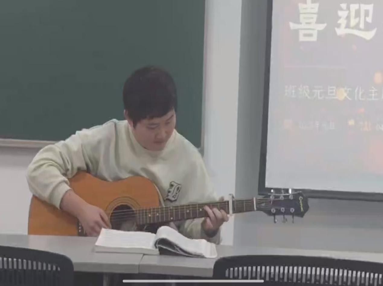 随后,文艺表演环节按既定流程有序推进。候浩群同学登台为同学们带来吉他演奏。随着演出的进行,他的指尖在琴弦上灵活游走,悠扬的旋律缓缓流淌,赢得了同学们的阵阵掌声与喝彩声,充分展现了其扎实的艺术功底,将现场气氛逐渐推向高潮。紧接着,王善奇同学为同学们带来小品表演。作品诙谐幽默,贴近校园生活,情节生动有趣,表演自然真挚,巧妙融入了同学们熟悉的日常场景,引得现场笑声不断,充分彰显了班级同学的创意与活力。
