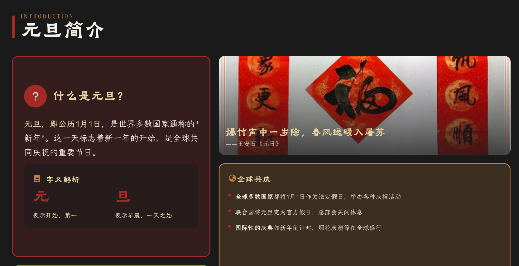 晚会伊始,主持人王善奇同学带领同学们开启活动流程。为帮助同学们系统了解元旦的文化内涵,主持人围绕元旦的公历新年定位、历史发展及各种传统习俗展开介绍。内容涵盖元旦名称的由来、古代王朝岁首祭祀的礼仪、近现代跨年庆祝形式的演变,同时具体说明北方地区元旦吃饺子、南方地区吃年糕等习俗的文化寓意,清晰呈现了元旦作为传统节日的文化价值,为晚会奠定了扎实的文化基础。