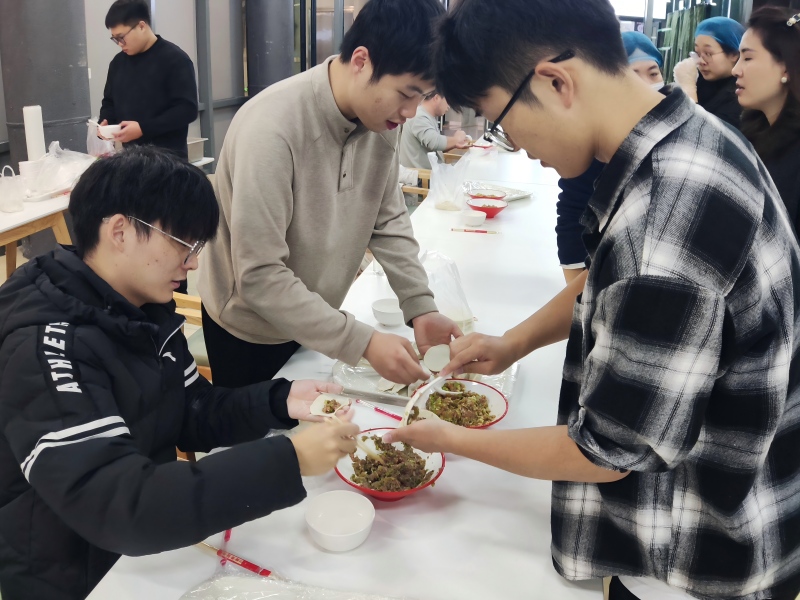 活动开始前,现场提前准备好了饺子皮、馅料及各类工具。随着活动正式开始,大家迅速分工协作,和面、调馅、擀皮、包饺子一气呵成。经验丰富的同学耐心示范,初次尝试的同学认真学习,现场欢声笑语不断,气氛热烈而融洽。一个个形态各异却饱含心意的饺子,在彼此的配合中逐渐摆满托盘,展现出团结协作、互帮互学的良好风貌。