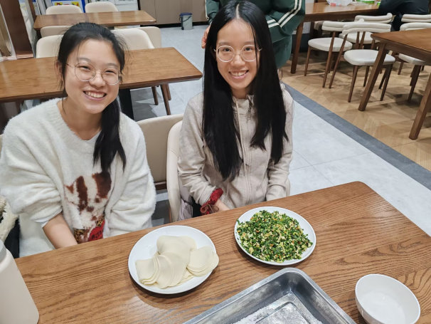 不同小组的成员们分工协作,八仙过海,各显神通。指尖翻飞间,形态各异的饺子陆续诞生——月牙形、元宝形,还有各种自创的“创意造型”。有些同学动作娴熟,眨眼之间便包出漂亮的形状,有些虽然对包饺子不甚熟练,却也对这项富有创造性的工作饶有兴味,而有些人则干脆将一整个西蓝花包入饺子中,暗自期待着有人会吃到这份“惊喜”……大家互帮互学,交流家乡不同的饺子包法与冬至习俗,操作间里充满了轻松愉快的讨论与鼓励。原本单调的劳动,因集体的参与而变得趣味盎然。