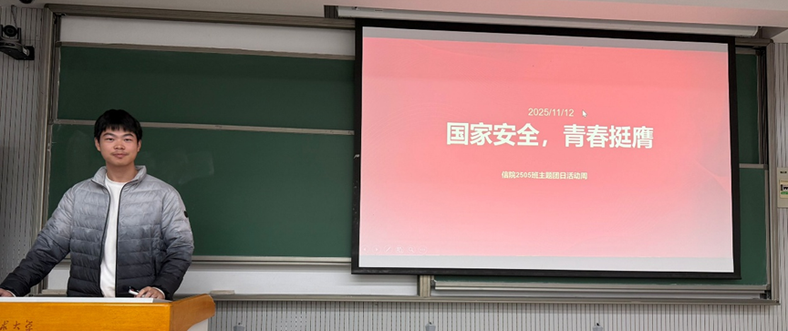 2025年12月8日晚上7点到9点,信息学院2025级本科5班于3A109教室开展了学期临近结束的团日活动,班级团支书解蕙雨负责活动的组织。本次活动旨在带领班级同学共同学习团员应了解的重要精神。现场学习氛围浓厚,同学们精神饱满,展现出新时代青年对理论学习的热情与专注,各位主讲人准备充分、讲解生动,台下同学凝神聆听、不时记录,形成了浓厚的学习互动氛围。