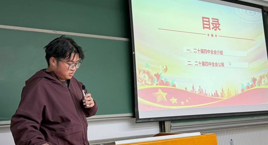 学习分享环节正式开始。班长朱学天围绕党的二十届四中全会精神,进行了系统梳理与解读,帮助同学们把握国家发展大局与时代前进方向,大家也都认真学习并做了笔记。