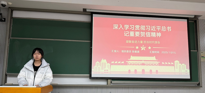 随后,组织委员张睿涵就深入学习贯彻习近平总书记重要贺信精神分享了体会,鼓励大家将贺信精神转化为奋进动力,同学们受到激励,燃起了前进的动力。