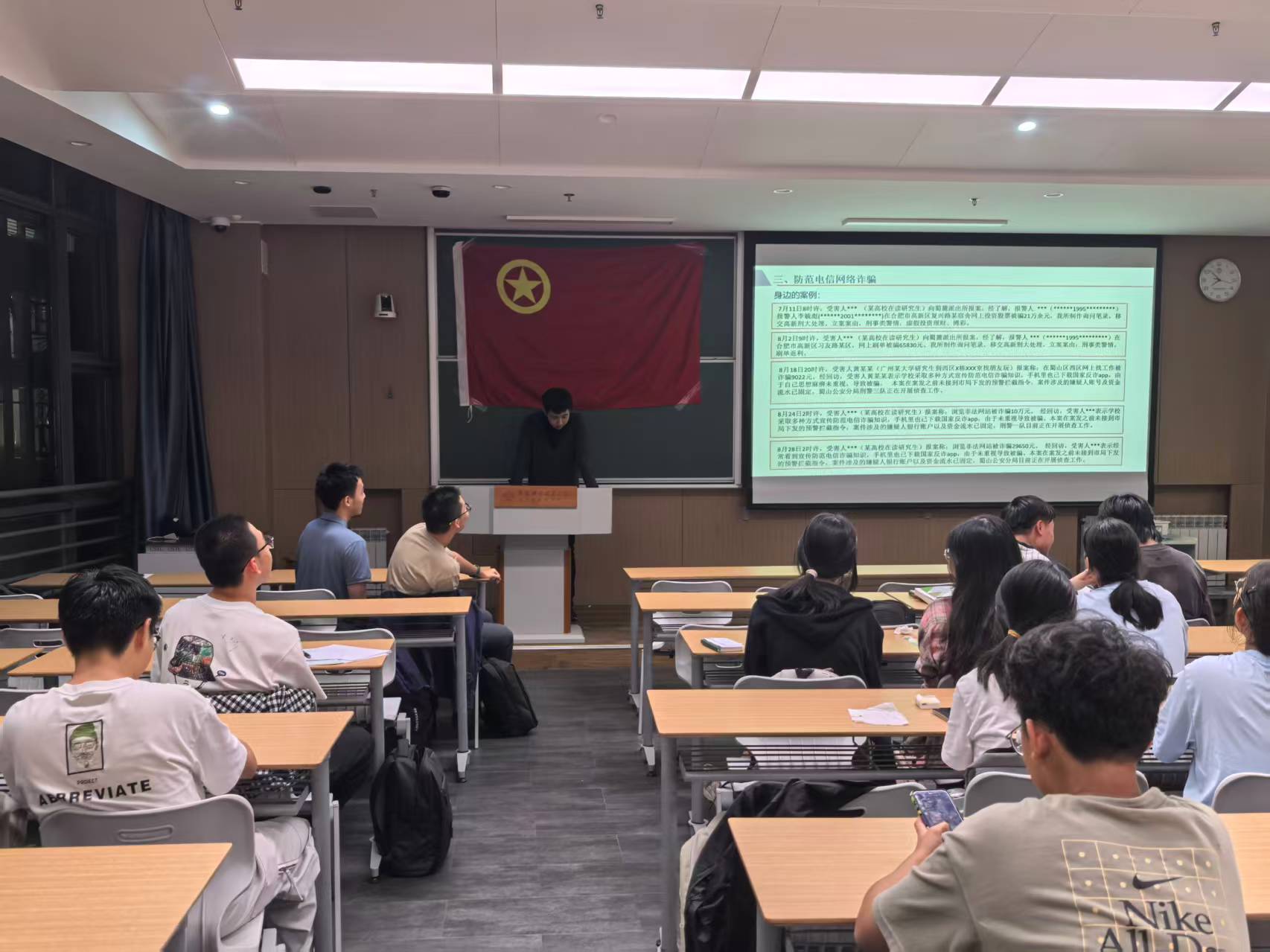 在安全事项提醒环节,胡老师通过“人物身份无法确认+沟通工具非面对面+要求汇款转账=电信诈骗”的简明公式,生动讲解了防范电信诈骗的要点。他还结合高校学生因浏览非法网站、参与网上刷单或虚假投资理财而受骗的实际案例,警示同学们即使安装了“国家反诈APP”,仍需保持警惕,遇到可疑情况应立即报警。