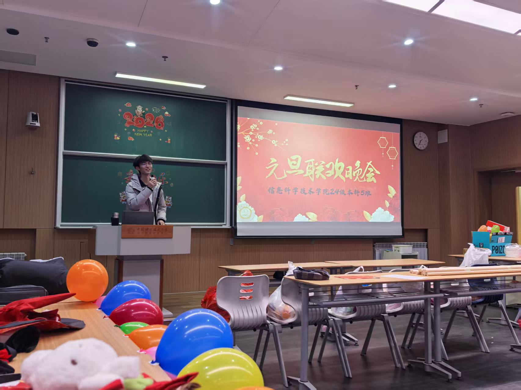 骏马踏春开新境,东风载梦逐新年。2025年12月31日晚,信息科学技术学院2024级本科5班在5107教室举办了一场别开生面的新年晚会。这场以“辞旧迎新,青春同行”为主题的班级盛会,汇聚了才艺表演、趣味游戏和暖心美食,为寒冷的冬日注入了浓浓的温情与欢乐。全体同学在欢声笑语中共同迎接新年的到来,为2025年画上了圆满的句号。