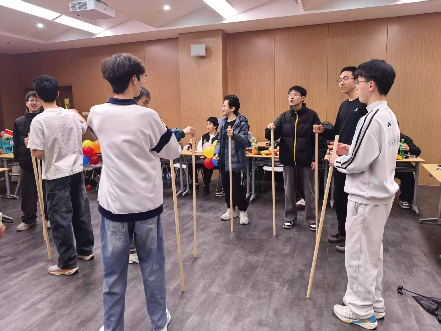 晚会最热闹的环节莫过于互动游戏。“不倒森林”和“你是我的眼”两大游戏吸引了三组同学参与角逐。“不倒森林”考验团队协作能力,队员们需要在节奏中快速交替接杆,稍有不慎便会功亏一篑;“你是我的眼”则要求蒙眼同学在队友的指挥下踩爆气球,既紧张又充满趣味。参赛同学全情投入,台下观众加油助威,欢呼声此起彼伏,现场气氛热烈非凡。