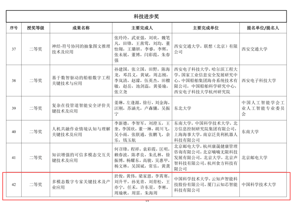 信息学院自动化系於俊副教授作为第一完成人,以中国科学技术大学为第一单位,联合云知声智能科技股份有限公司、厦门云知芯智能科技有限公司共同攻关完成的科研成果“多模态数字专家关键技术及产业应用”获科技进步二等奖。