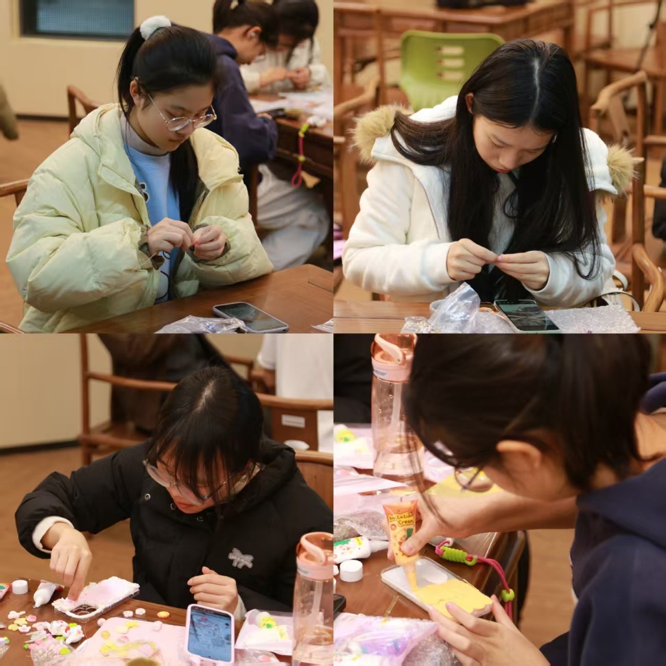 在众人好奇的目光下,负责人发放了 DIY 水晶树的材料包,同时为每位女同学准备了一份特别的礼物——DIY 手机壳。采购人预先了解了每位女生的手机型号,并精心为她们挑选了美观的图案,可谓用心满满。各活动小组全神贯注,沉浸于手工制作的乐趣之中,在欢声笑语间畅谈日常,氛围十分融洽。