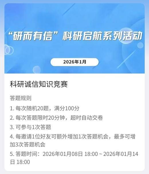 科研能力的提升需要以恪守学术道德为基石,为促进从理论认知迈向实践,2026年1月8日至14日,系列活动第三场——线上科研诚信知识竞赛成功举办。
