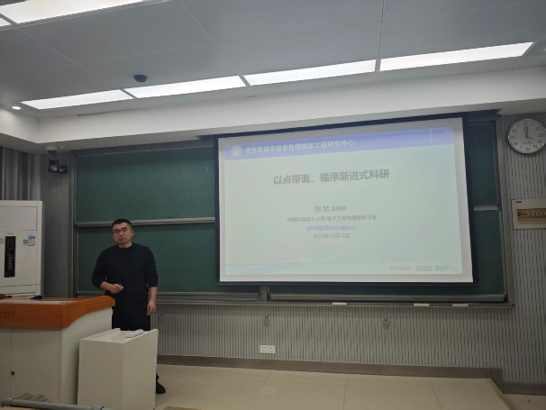 2025年12月10日,系列活动首场学术沙龙在中国科学技术大学西校区拉开帷幕,由学院学生会具体承办。学院副教授张结应邀作“以点带面、循序渐进式科研”主题分享。张结结合其从本土到海外的求学科研经历,以及在语音信号处理领域深厚的学术积累与产业转化的成功经验,系统剖析了如何选择科研切入点、如何逐步深化与拓展研究课题。他特别强调了扎实的基础训练与清晰的长期规划在科研生涯中的关键作用,为刚刚踏上科研之路的同学提供了切实可行的行动指南,有效化解了起步阶段的困惑。